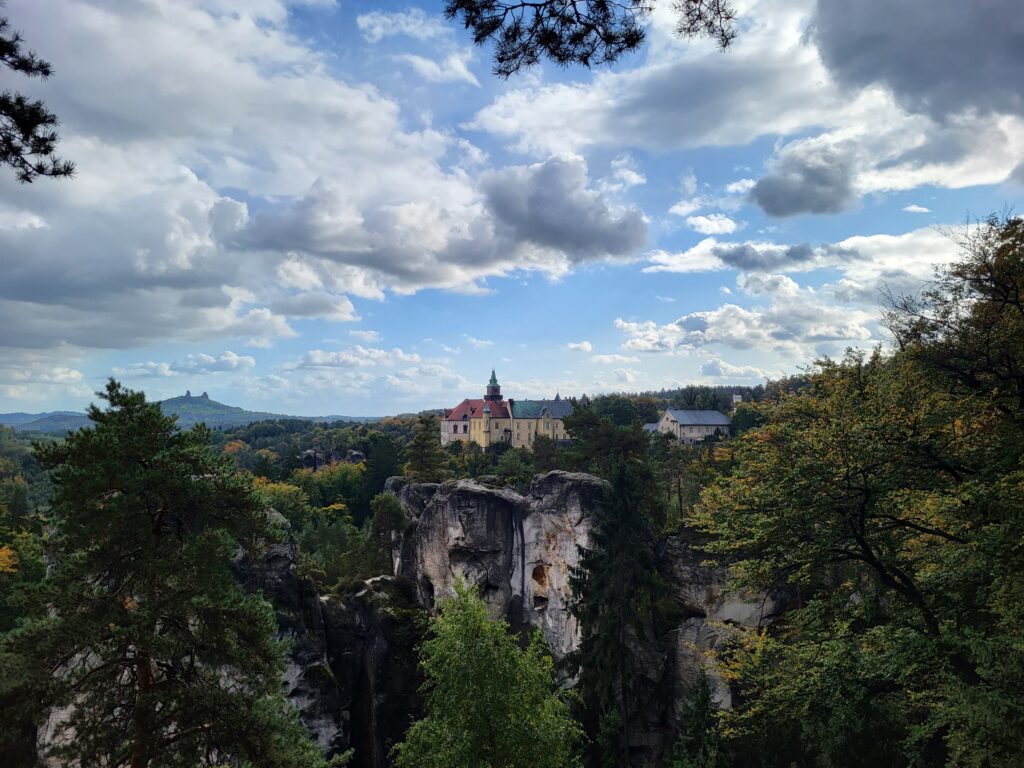 Vanaf kasteel Hrubá Skála (waar je ook je auto kan parkeren) kun je een mooie boswandeling maken met uitzicht op de rotsenpartijen en het romantische kasteel Valdštejn.